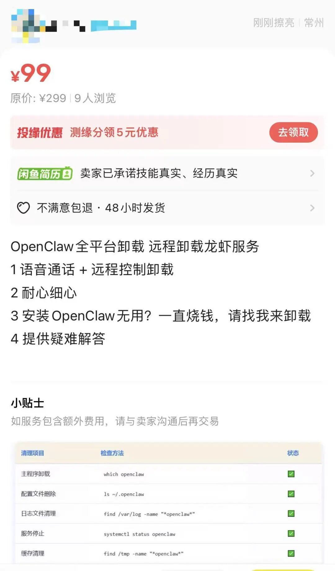 有商家在二手交易平台称支持远程卸载OpenClaw。